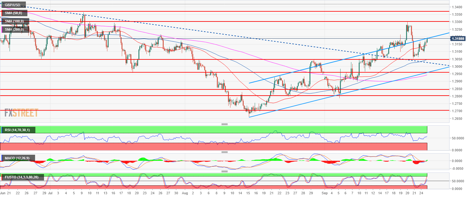 - GBP/USD is trading in a bull channel above rising and widening 50, 100 and 200-period simple moving averages while the RSI, MACD and Stochastics indicators are in positive territories, all suggesting potential gains ahead.