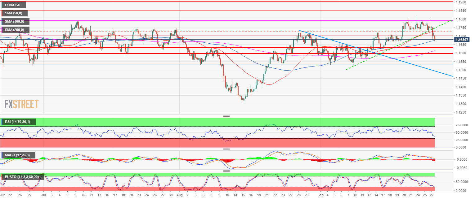 - EUR/USD broke below the bull trendline (green) and the 1.1700 figure. It is currently testing the 100-period simple moving average. The RSI, MACD and Stochastics are in bearish territories suggesting more losses ahead.