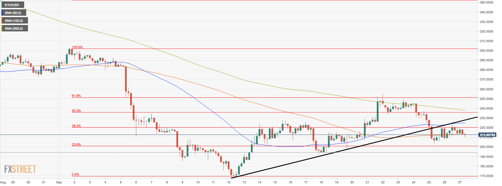 From the intraday perspective, ETH/USD stays below $220, which is considered to be a strong technical level created by 38.2% Fibo retracement for the downside movement from September 1 high and followed by SMA50 (4-hour chart), and the short-term upside trendline from September 12 low. Once this area is cleared, the bulls will have a chance to take prices towards the next target at $235  handle (50.0% Fibo retracement).