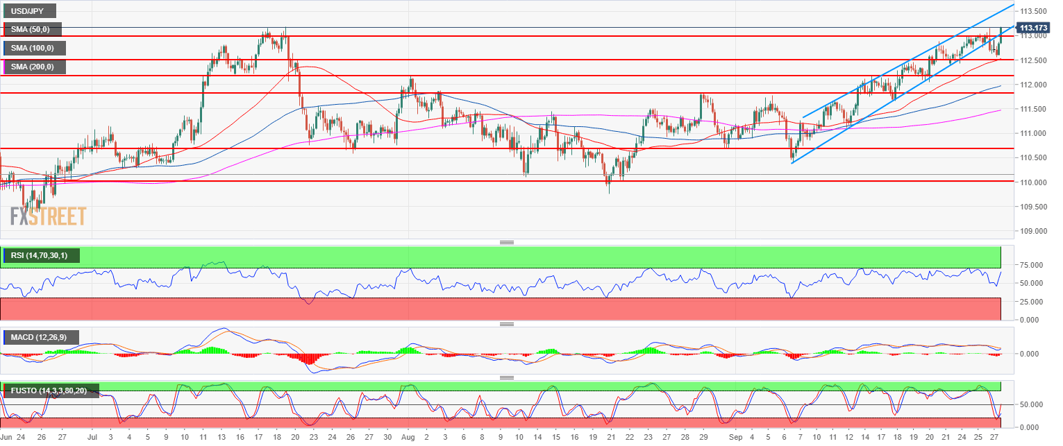 - The 50, 100 and 200-period simple moving average on the 4-hour time frame are rising and widening suggesting a bullish momentum. However, counter-trend traders are currently preventing the market to break above 113.18 July high. A clear breakout above the level would open the door to 114.00 figure and 114.80 (November 2017 high).