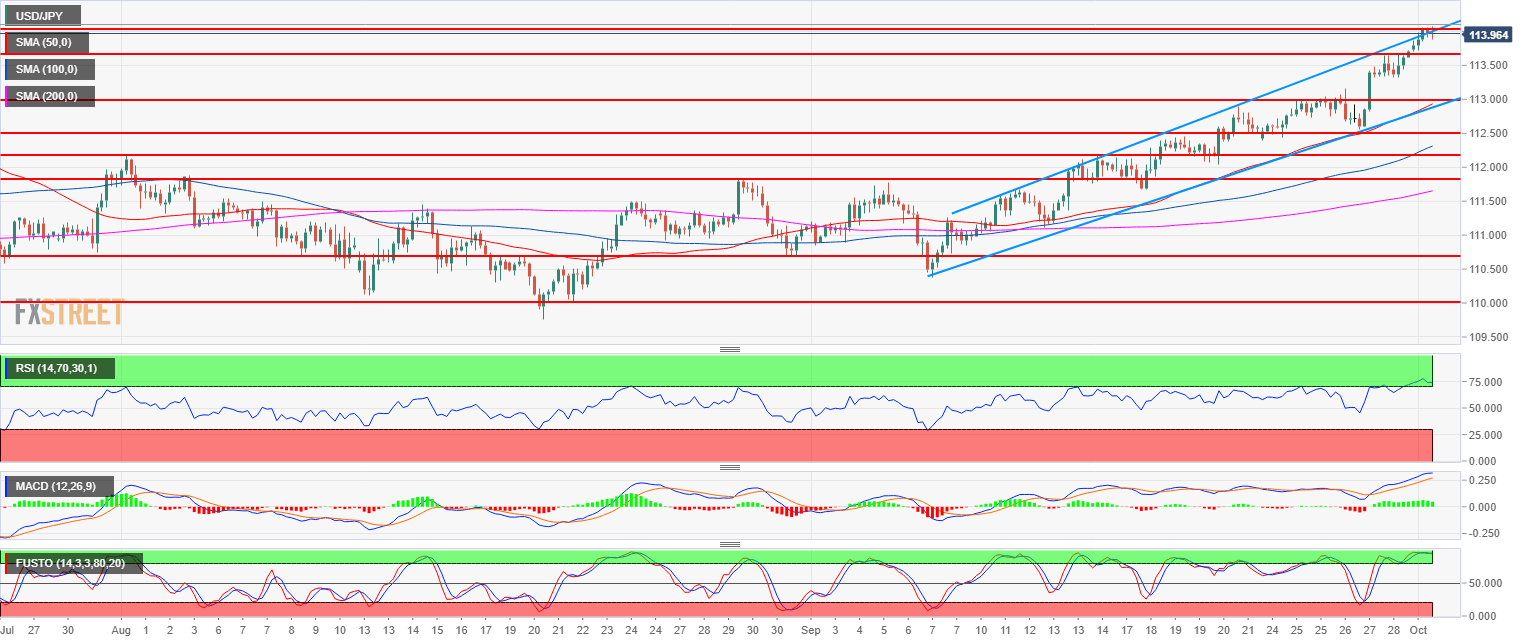 - USD/JPY bulls extend the rally to 114.00 resistance.