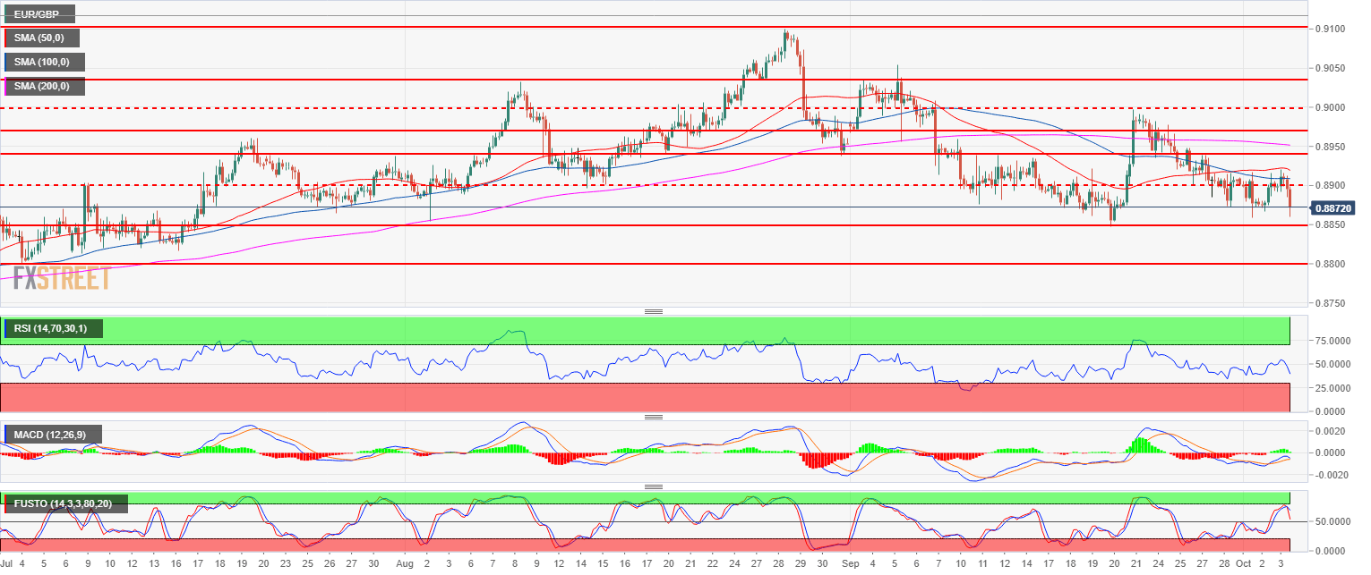 - EUR/GBP is now approaching the weekly low at 0.8859. It will be interesting to see if bulls can support the market above the 0.8859 level. The RSI, MACD and Stochastics indicators have turned bearish while EUR/GBP is trading below its 50, 100 and 200-period simple moving averages.