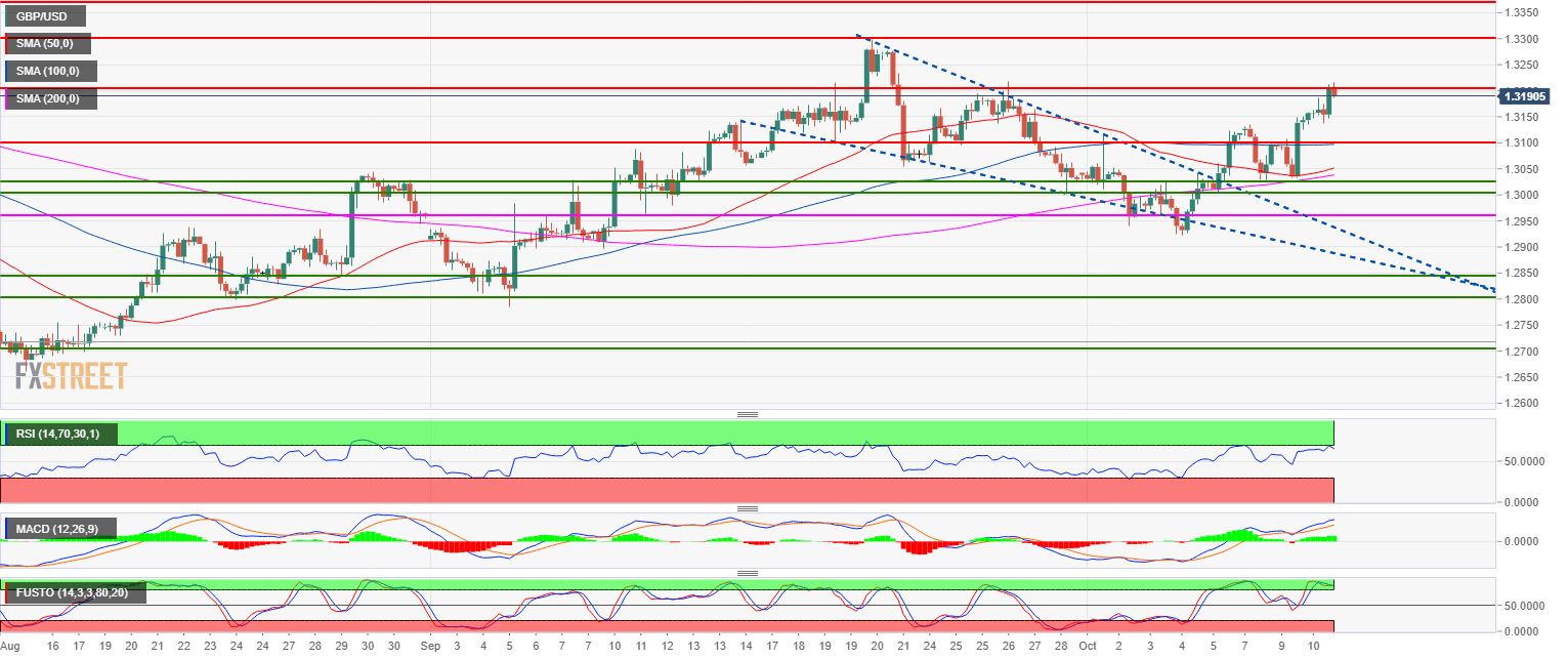 - After breaking from the bull flag, GBP/USD reached the 1.3200 figure. GBP/USD is facing resistance at the 1.3200 level while the Stochastic indicator is in overbought condition. While the bias remains bullish the market might need to correct to 1.3150 (September 21 low) or even to 1.3100 figure before potentially resuming the bull trend.