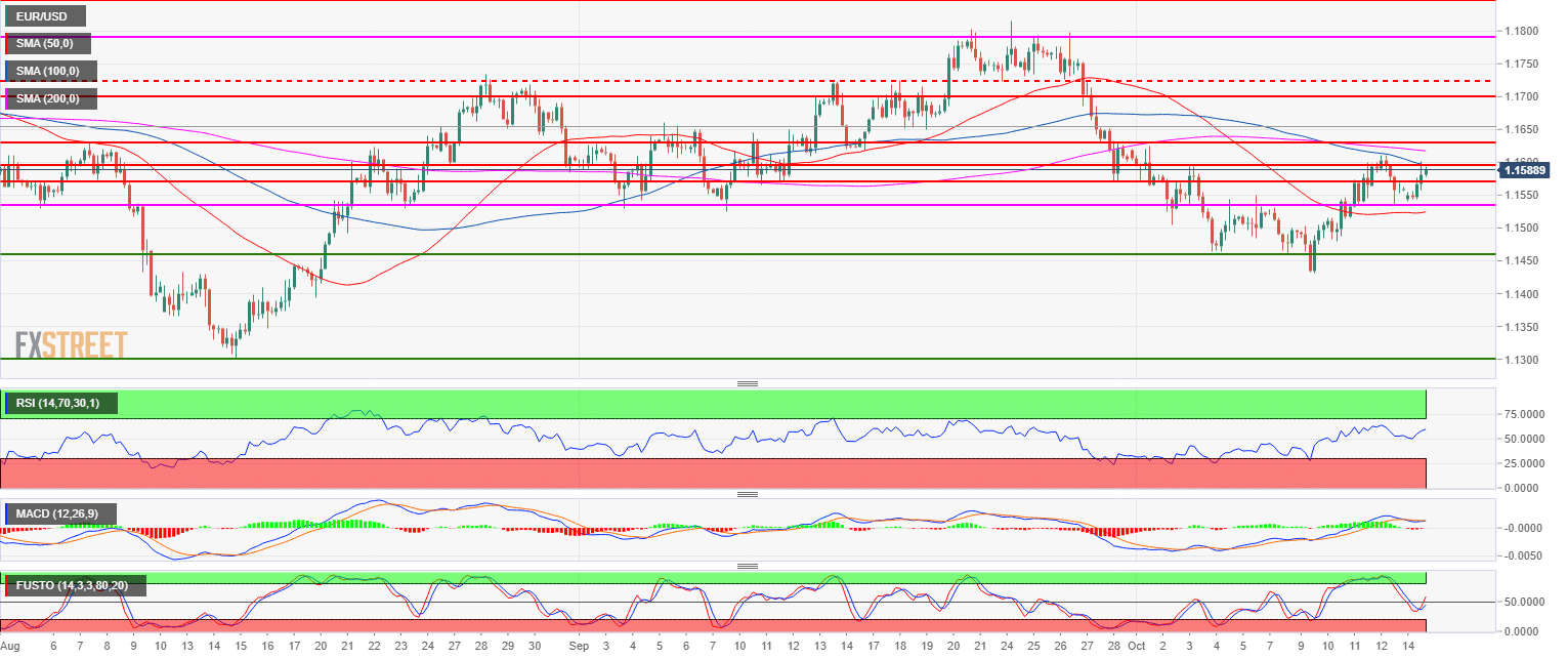 - EUR/USD is trading above its 50-period simple moving average as the market is trying to break above the 1.1600 figure. The RSI and Stochastic indicators are trading above the 50 line suggesting that the path of least resistance is to the upside.