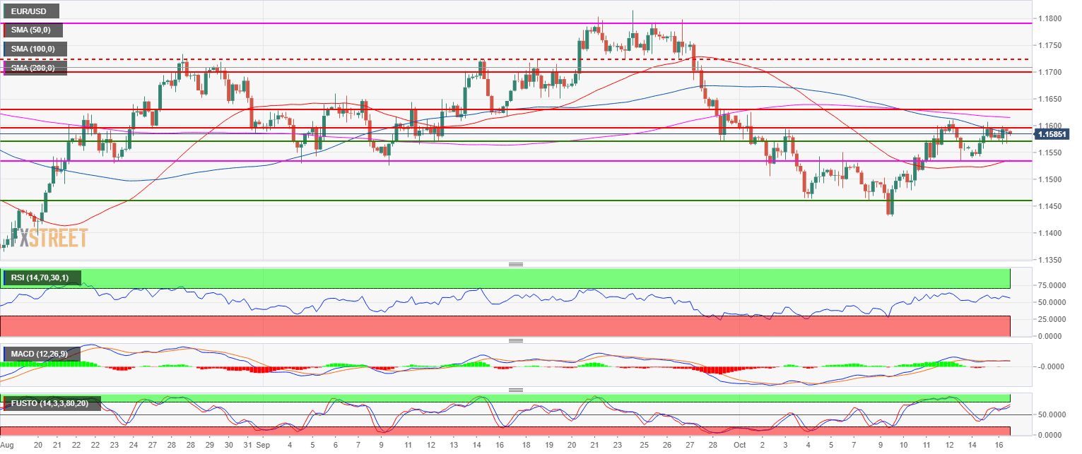 - EUR/USD is holding above 1.1530 for the third consecutive day. The bulls are challenging the 100 SMA as the market is trading in a tight 30 pip range below the 1.1600 figure. The RSI, MACD and Stochastic indicators are constructive for more gains. The 1.1600-1.1630 resistance might be hard to break but if it does the bull run might accelerate to 1.1700 figure.