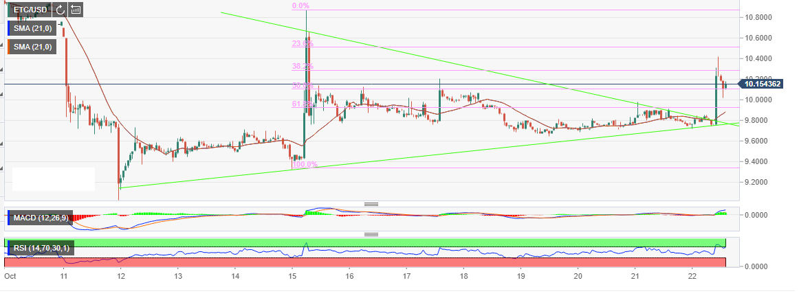 Ethereum Classic is bullish in a market that sinking in the sea of red. The crypto is the biggest winner on Monday following a 3.98% correction on the day. Prior to the spike on Monday 22, ETC/USD was locked in a range between the upper limit at the 50% Fib level between the highs of $10.87 and the lows of $9.34 and the lower limit at $9.6.