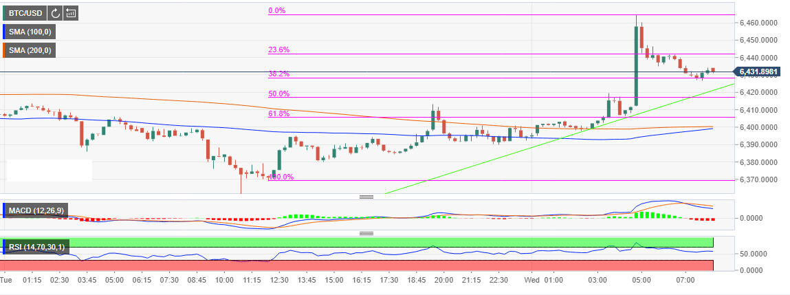 After taking a trip below $6,400 earlier this week, Bitcoin found balance around $6,370 (swing low). The market is saying bye to the consolidation and buyers are ready to take advantage and gain ground against. There has been a pullback above $6,400 on Wednesday where BTC/USD corrected higher testing the resistance at $6,460. The momentum has died down as Bitcoin retreats towards $6,400. For now, the 38.2% Fib level is holding the price at $6,430 while the general trend is slightly bullish. The bullish trendline will offer support above $6,400 but both the 100SMA and the 200SMA will stop declines around the same level as well.