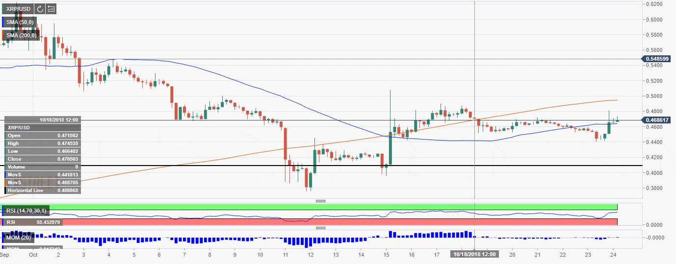 Looking technically, XRP/USD is supported by SMA50 (4-hour chart) at $0.4640. Once this short-term support area is broken, the downside may be extended towards $0.4600 and $0.4427 (last week’s low). Ultimate bearish target lies with $0.4300 (DMA50)