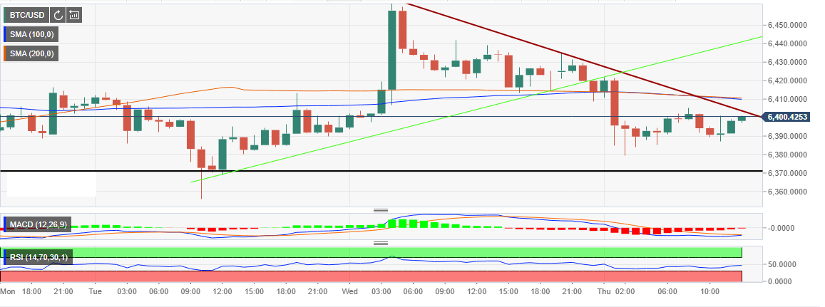 At present, Bitcoin is hammering on the short-term resistance at $6,400 in readiness for a bullish move above the trendline resistance. BTC/USD suffered subtle declines yesterday but the bulls remained unmoved above $6,370. A low was formed at $6,380 before a pullback took the price above $6,390. However, $6,400 is proving to be a significant hurdle.
