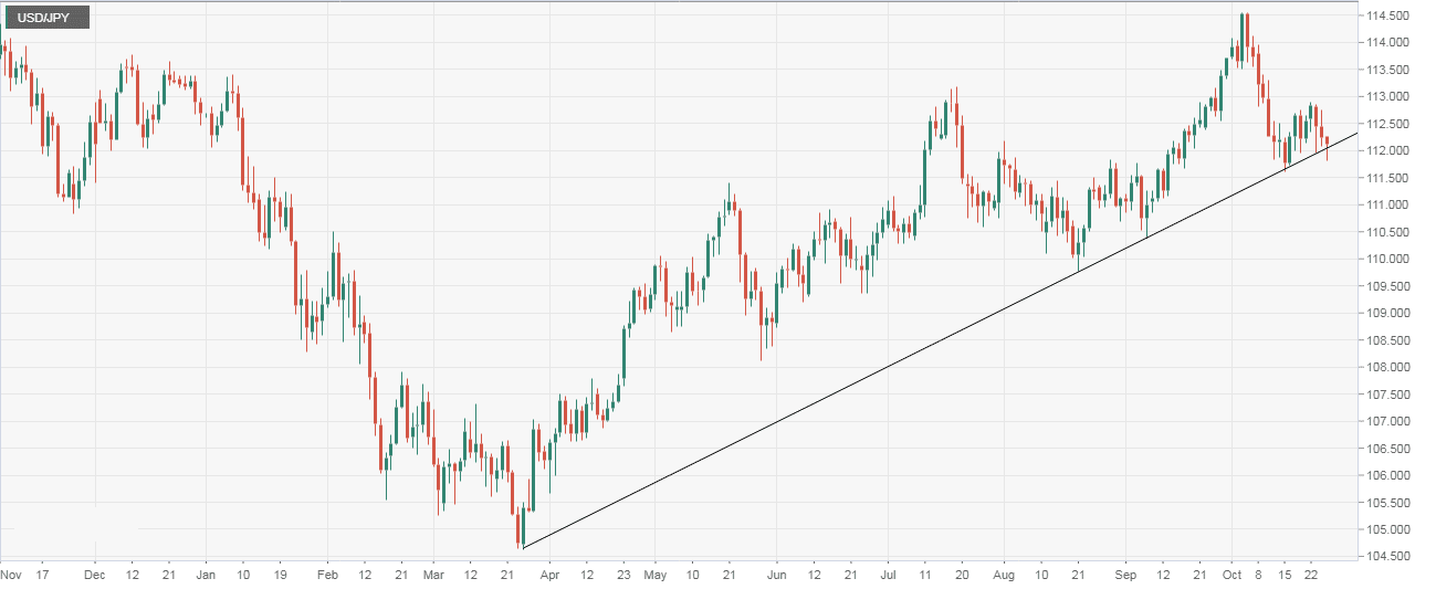 - Currently, the USD/JPY pair is trading just above the support of the trendline sloping higher from March lows, having printed a nine-day low of 111.82 earlier today.