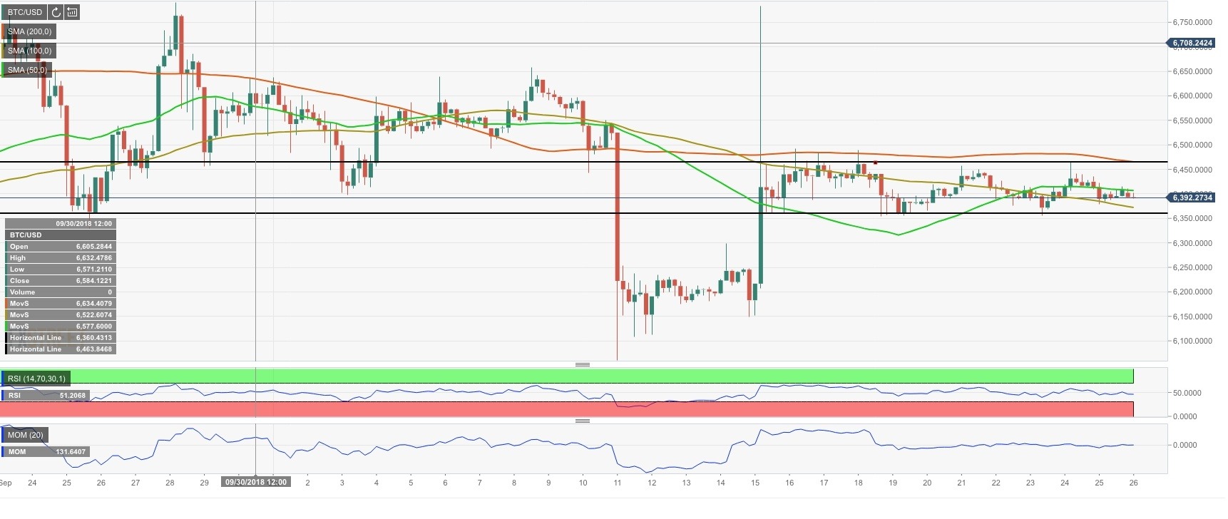 BTC/USD is trading at $6,395, practically unmovable since this time on Thursday. The intraday technical picture implies that more rangebound trading is in store as both Relative Strength Index (RSI) and Momentum indicator are flat.
