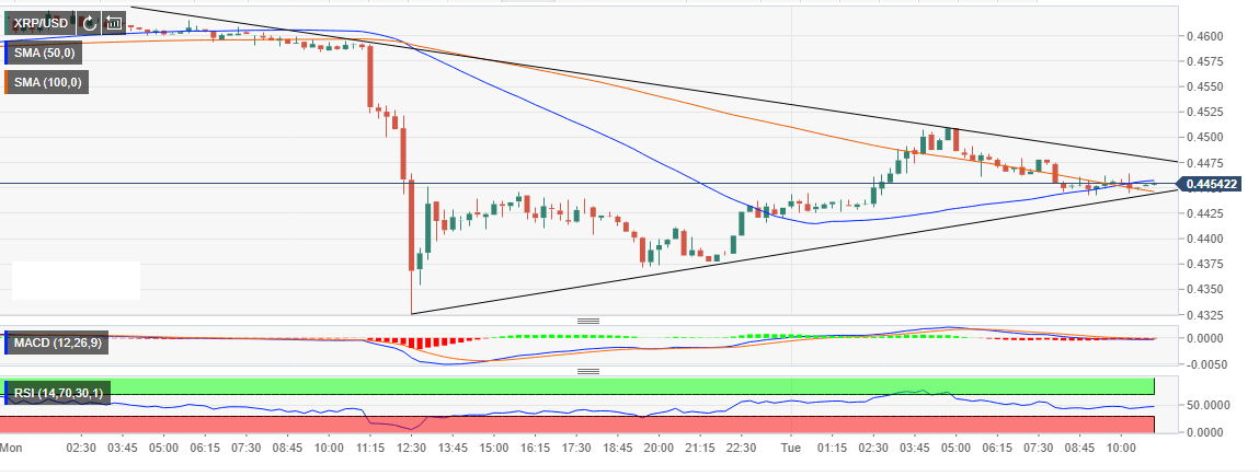 There is a contracting triangle approaching a breakout in the short-term but first the buyers must clear the resistance at the 50 SMA on the 15-minutes chart. Creating a support above $0.45 will open the way for gains heading to the supply zone at $0.46 and eventually $0.50.
