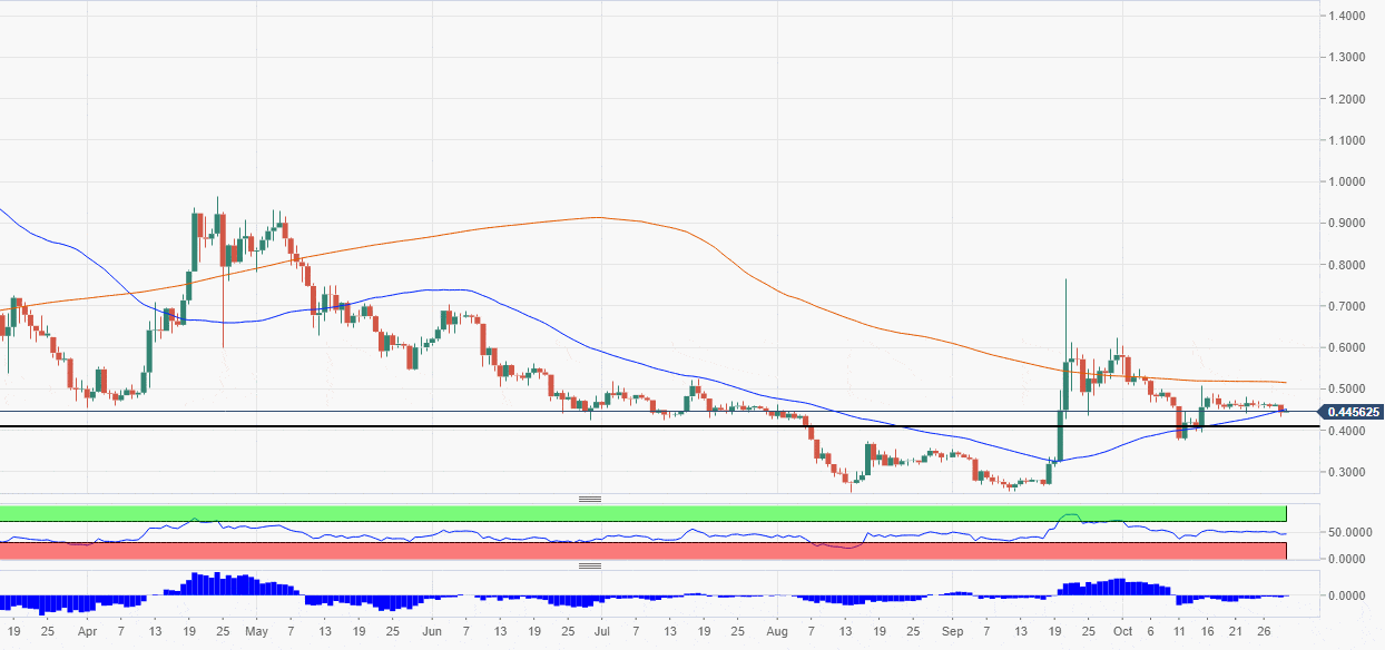 XRP/USD stays below DMA50 (currently at $0.4510). which is a bad signal for buyers. The coin needs to recover above $0.4500-$0.4510 area to mitigate the bearish pressure and get a chance for an extended recovery towards the next target at $0.477 (this is a congestion zone that stopped the upside since October 19).