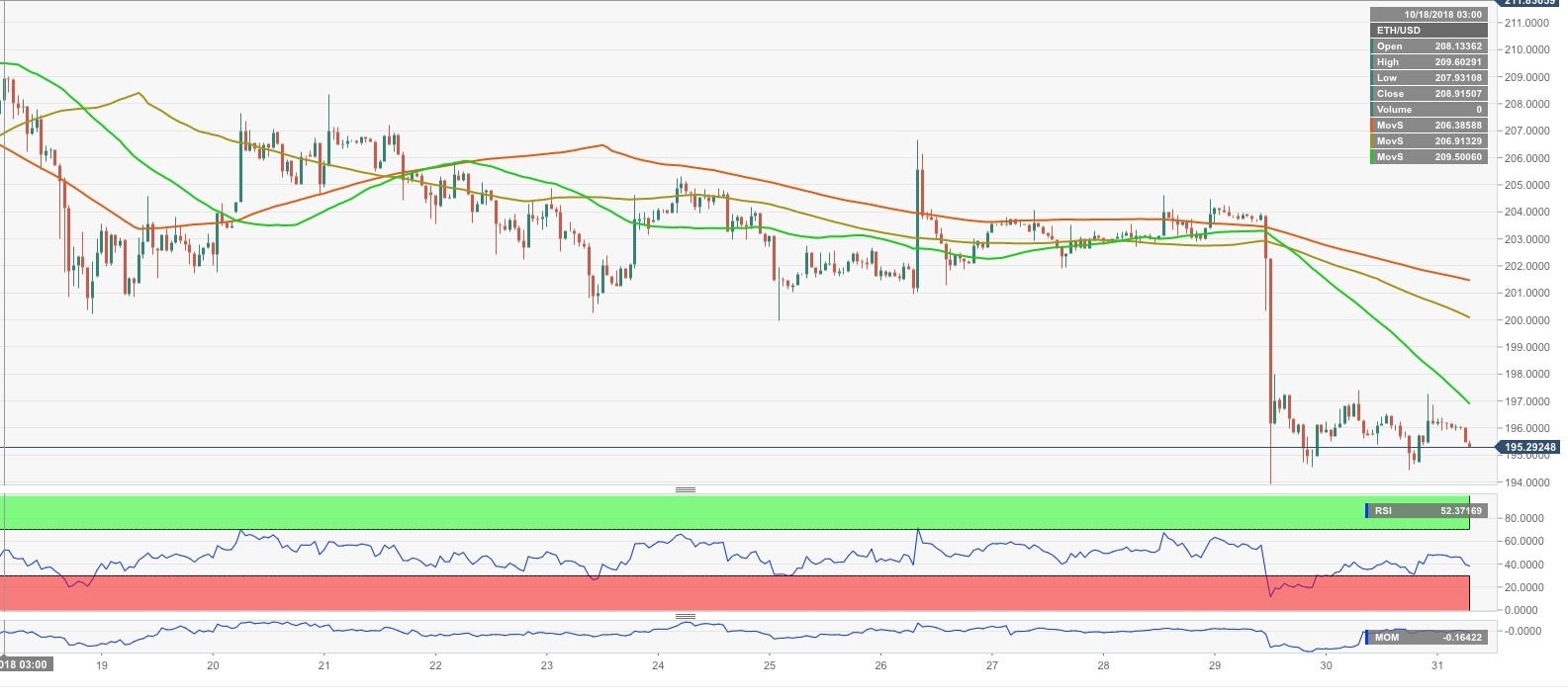 ETH/USD stays under $200 handle, but the downside momentum has faded away. The coin has entered a consolidation phase with the nearest critical support seen at October 11 low of $186.00. Once it is cleared, September 12 low at $167 will come into focus.