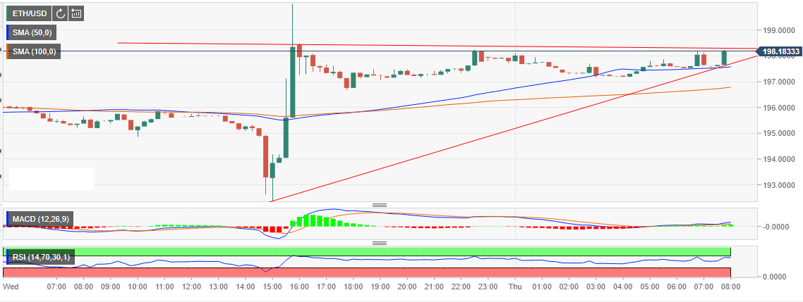 The RSI at 64.00 is heading upwards, which is a significant buy signal. Moreover, the MACD has made it into the positive region (+0.12931); another solid buy signal. In addition, the short-term rising wedge pattern shows that a bullish breakout is around the corner. With this trend ETH/USD will retrace higher in the short-term to claim the broken support at $200. Meanwhile the 50 SMA is offering support at $197.62 and the 100 SMA currently at $196.80 (15-minutes).