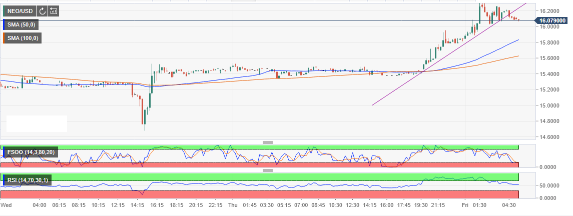 NEO is finding balance at $16.0 following a nice bullish surge that kicked off on Thursday. Although NEO is currently trimming intraday gains, the tables show a 1.67% rise on the day. A broader look at the market shows that the bulls are back with most of the assets dancing in the green. The retracement comes after the week began with a sudden waterfall drop.