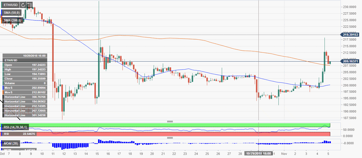 ETH/USD is back above $200 handle but the upside momentum is fading away. The Relative Strength Index reverted from the overbought territory and stays flat, while Momentum remains elevated. The coin is supported by $207.73 (SMA200, 4-hour) and psychological $200. Once this area is cleared, the recovery will be finished and sell-off may continue towards $190.00.