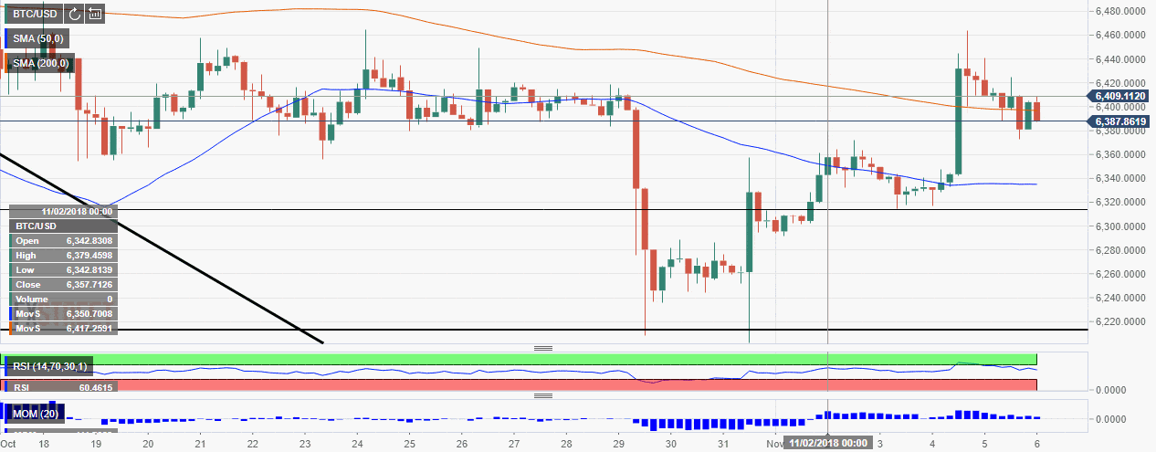 On the intraday chart, BTC/USD has entered a congestion zone of $6,400-$6,380 that includes a lower border of October consolidation channel. A sustainable movement lower will take us towards $6,336 (SMA50, 4-hour chart) and psychological $6,300.The next important support lies with $6,200.