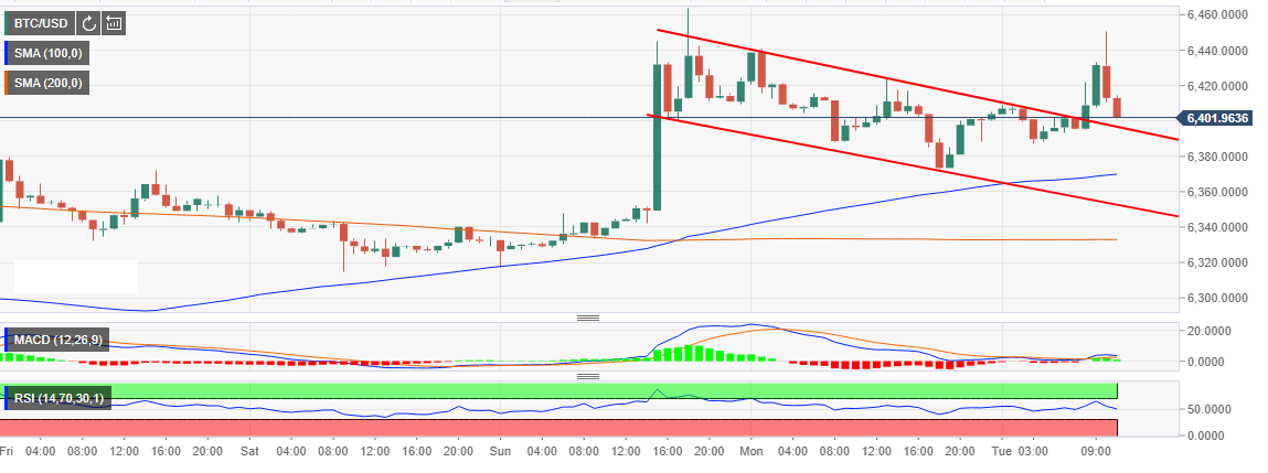 - Bitcoin has established a support at $6,380 while defending the short-term support at $6,400.