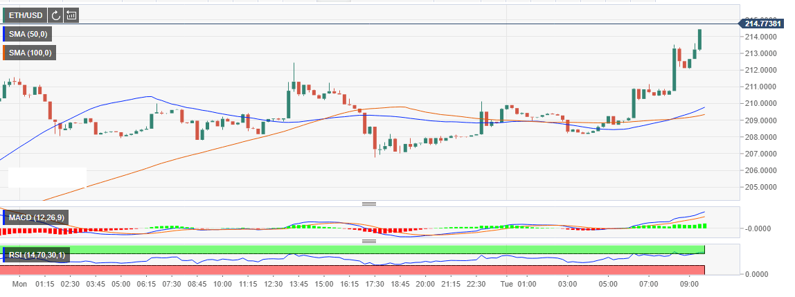 Ethereum can be seen trading at $241 after breaking above the short-term resistance at $210. The uptrend kicked off on Sunday where ETH/USD recovered above $200. The price is currently heading towards the resistance $218 and eventually attack $220 before projecting to $230 in the near-term. The crypto is trading above the moving averages to show that the trend bullish supported by the positive RSI signal and the MACD at +1.3656.