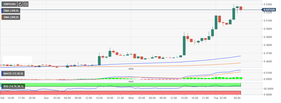 XRP/USD broke the range to the upside at $0.47. The crypto opened the trading on Monday at $0.469 and closed the day’s trading above the key resistance we explored yesterday at $0.50. As predicted in the price analysis, Ripple has extended the gains past $0.50 forming highs of $0.528 on Tuesday. At the time of writing the markets third largest crypto is exchanging at $0.5233.