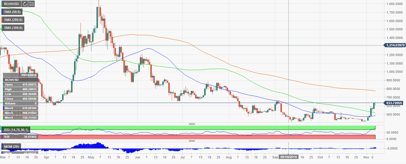 Bitcoin Cash, the fourth largest digital asset with market value $11B, is trading at $634 at the time of writing. The gained 13% in the recent 24% and over 46%% in seven days.