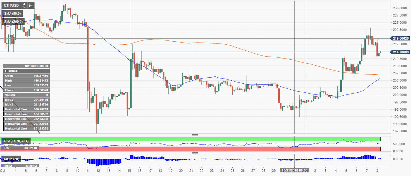 The local support area for ETH/USD is created by a confluence of SMA levels around $207 (4-hour chart). Once it is cleared, the downside may continue towards $200, where new buyers are likely to join the game. On the upside, we need to get above $220 and $223 to proceed to the stronger resistance at $232, which capped the recovery attempts back in September.