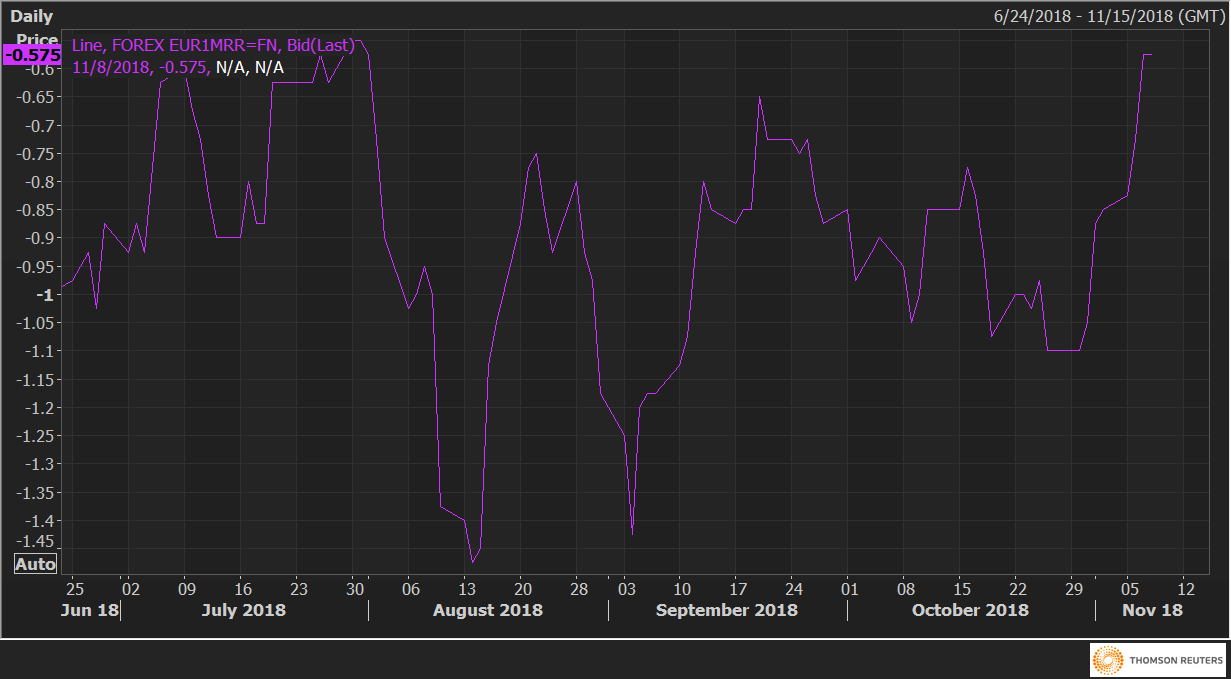 The EUR/USD one-month 25 delta risk reversals (EUR1MRR) have risen to -0.575 – the highest level since Aug. 1.