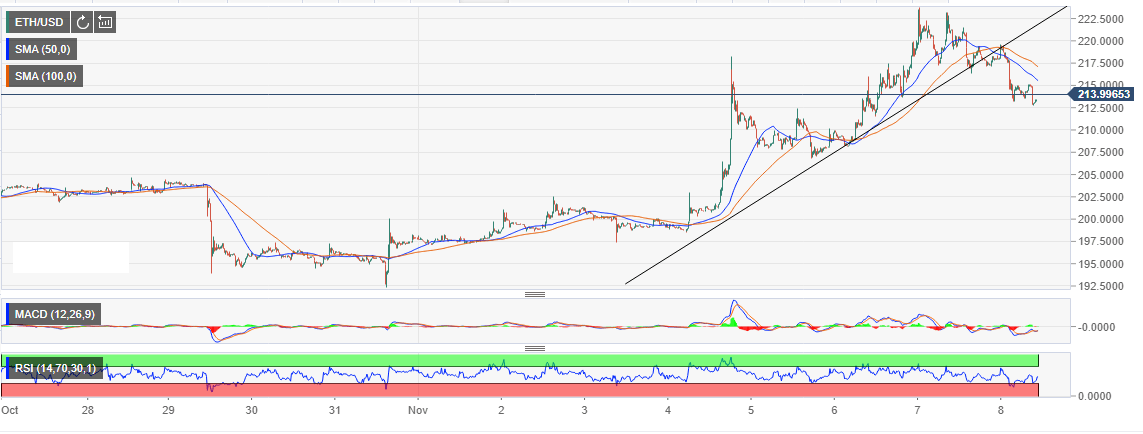At the time of writing Ethereum is trading $213 after dropping from the monthly highs at $223.79. While the correction has canceled most of the gains made in the last couple of days, all is not lost for Ethereum bulls who are defending the newly formed support at $212. The key resistance at the moment is at $215 while the highs at $223.79 will allows bull to push for gains above $230 and form a path towards $250. There is an upside move ongoing at the time of press, similarly, the RSI is heading north to show that the buyers have the influence in the market.