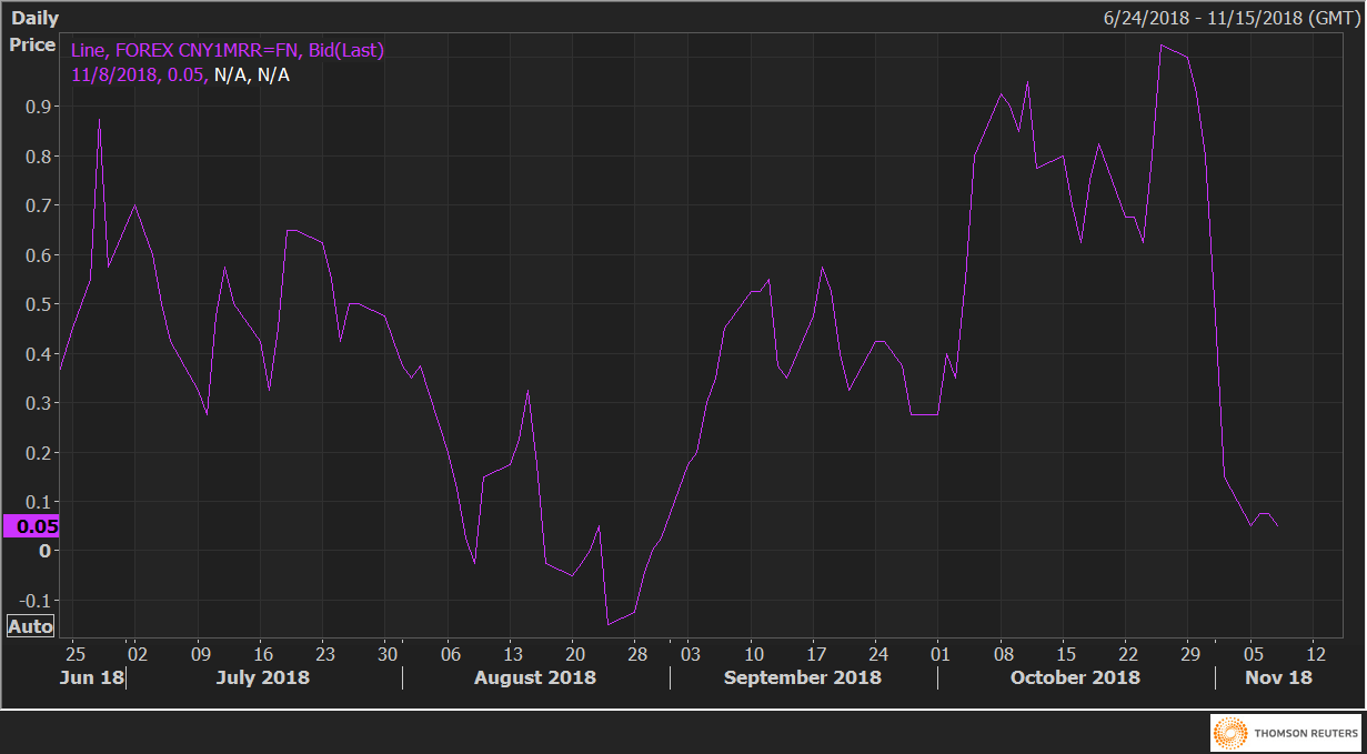 The USD/CNY one-month 25 delta risk reversals (CNY1MRR) gauge, which shows the implied volatility premium for CNY puts over CNY calls, has dropped sharply in the last two weeks.