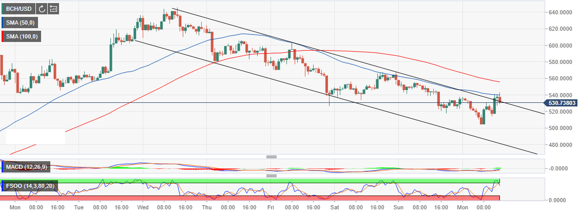 At press time, Bitcoin Cash value is at $530. The digital asset is attempting to break free from the bearish channel resistance. However, the hourly 50 SMA is also capping gains at $540. Similarly, another hurdle will be faced at the 100 SMA on the same chart. $560 is the immediate supply zone presenting a critical breakout point that will place BCH/USD on an upward path to $600.