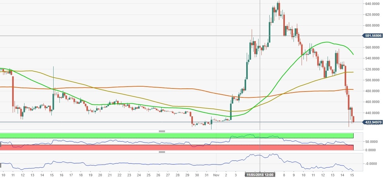 From the technical point of view, BCH/USD stays above 2018 low registered at $410 (September 12). A messy hard form may lead to more sell-off, so if $410-$400 area is broken, the coin might collapse even further with the initial aim at $322 (the lowest level since October 2017). However, considering that the coin is strongly oversold, a rebound from the above said support zone looks likely with the initial aim at $482 (SMA200, 4-hour), followed by $500.