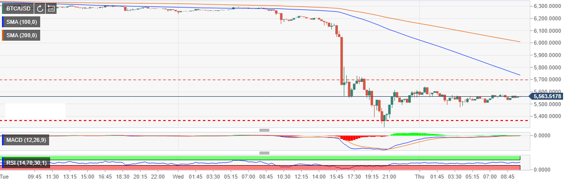 As mentioned, Bitcoin failed to find support at $6,000. Neither did the former support at $5,800 help to stop the slide. The fall found bearing around $5,500 but further break down had it test $5,300. There was a rebound with the buyers putting in their best effort to dust their shows and pushed the price above $5,600. However, Bitcoin is currently locked within a narrow range with a short-term support at $5,500.