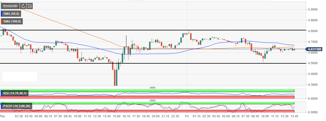 EOS price is range bound after a slight recovery from the support at $4.3. The current sideways trend is likely to continue in the short-term. The range resistance at $4.8 is the initial resistance while the critical resistance lies at $5.0. The moving averages are also limiting the gains above the current price of $4.63. On the downside, EOS will find the first support at $4.6 while the second resistance is at the range support at $4.5.