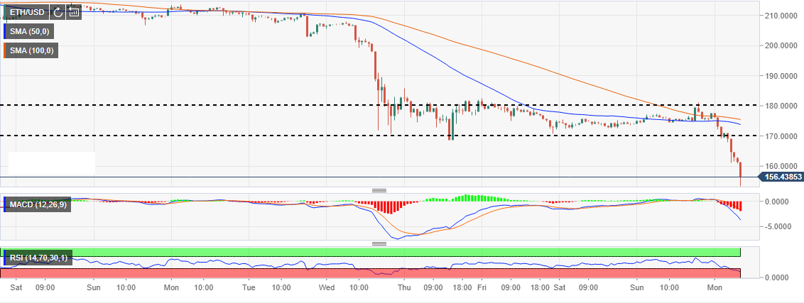 Breaking technical levels is likely to be the reason behind the fall. ETH/USD fell below both the 50 SMA and the 100 SMA. This triggered more declines while the shorter term moving average maintained the position below the longer term 100 SMA. The bearish trend will most likely find bearing above $150 as the indicators show huge oversold levels. The RSI at 21.42 shows that the sellers are getting exhausted. A correction above $170 will ensure that the buyers can have in sight $200.