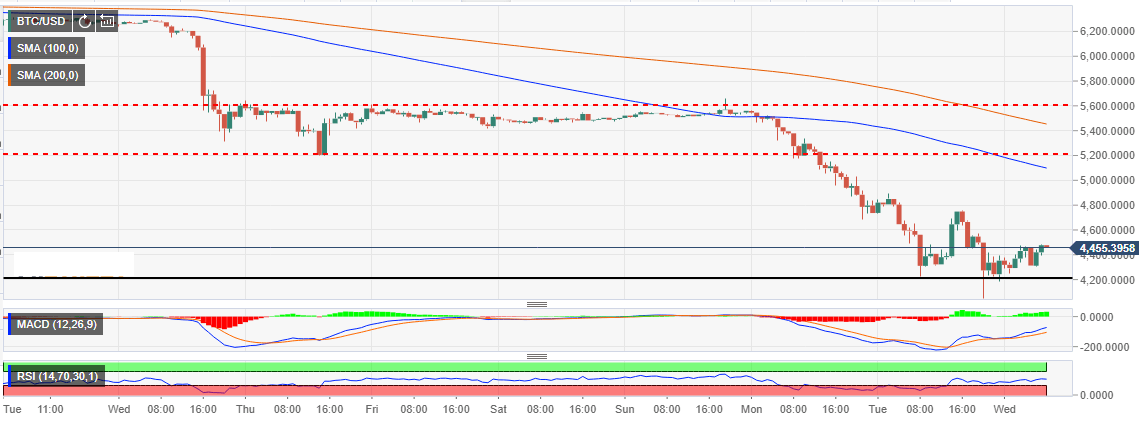 Meanwhile, Bitcoin is trading at $4,453 after a slight pullback from the support at $4,200. The crypto retested this support yesterday after a reversal headed for $5,000 failed to break past $4,800. The initial resistance is at $4,600 while $4,800 is a critical hurdle. Bitcoin needs to correct above $5,000 for it escape the frequent declines. Indicators are positive on the hourly chart with the MACD revamping the trend to cross into the positive region while the RSI has maintained position above the oversold, to show that the buyers are still present and buying activity is rising.