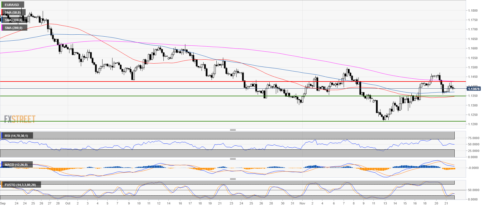 - EUR/USD bulls failed to break above the 200 SMA and 1.1430 resistance The RSI indicator is near 50, the MACD is bearish and so is the Stochastic indicator.