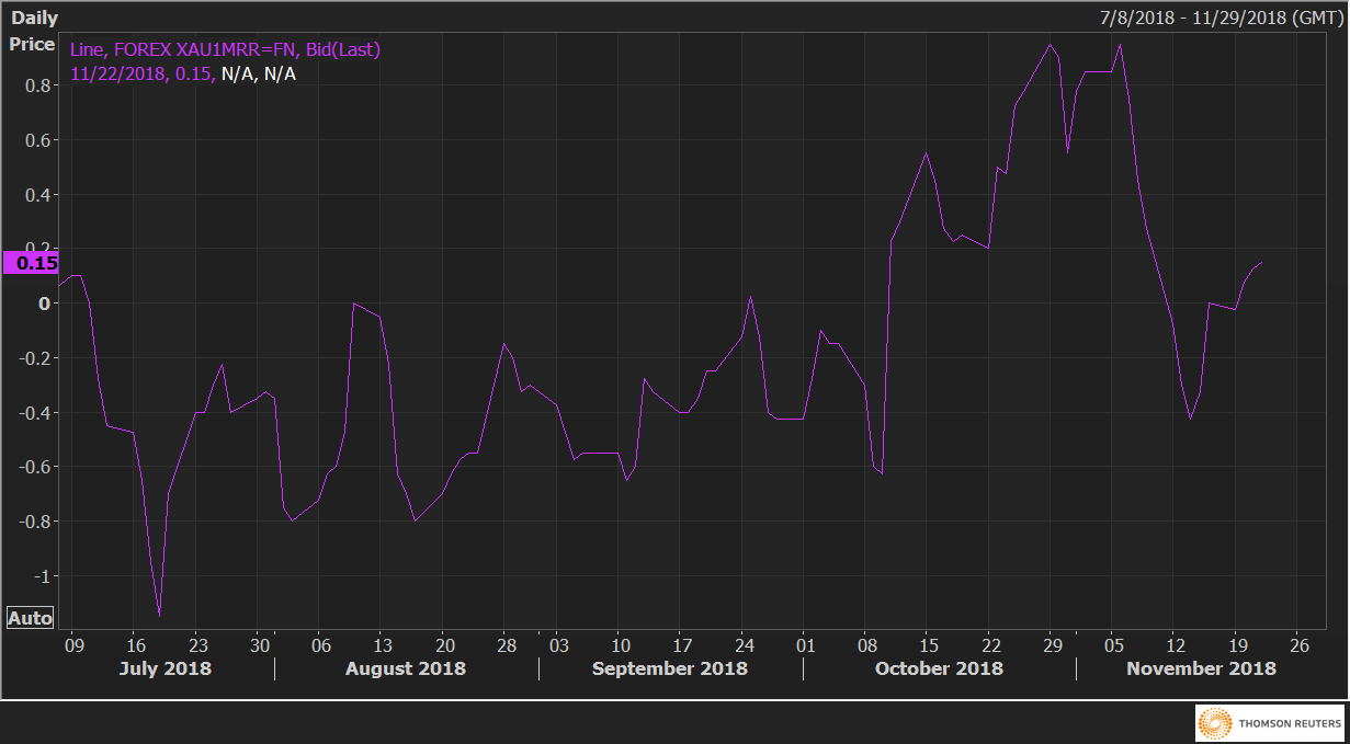Gold (XAU/USD) one-month 25 delta risk reversals (XAU1MRR) are currently trading at 0.15 in favor of gold calls, having turned positive on Tuesday.