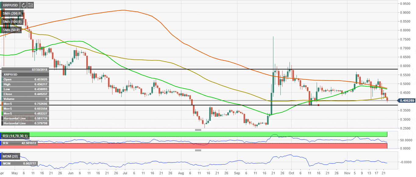 XRP/USD is changing hands at $0.4057, off the Asian low reached at $0.3937. Despite the recovery, th second largest crytocurrency with market value of $61.4B is still down over 7% in recent 24 hours.