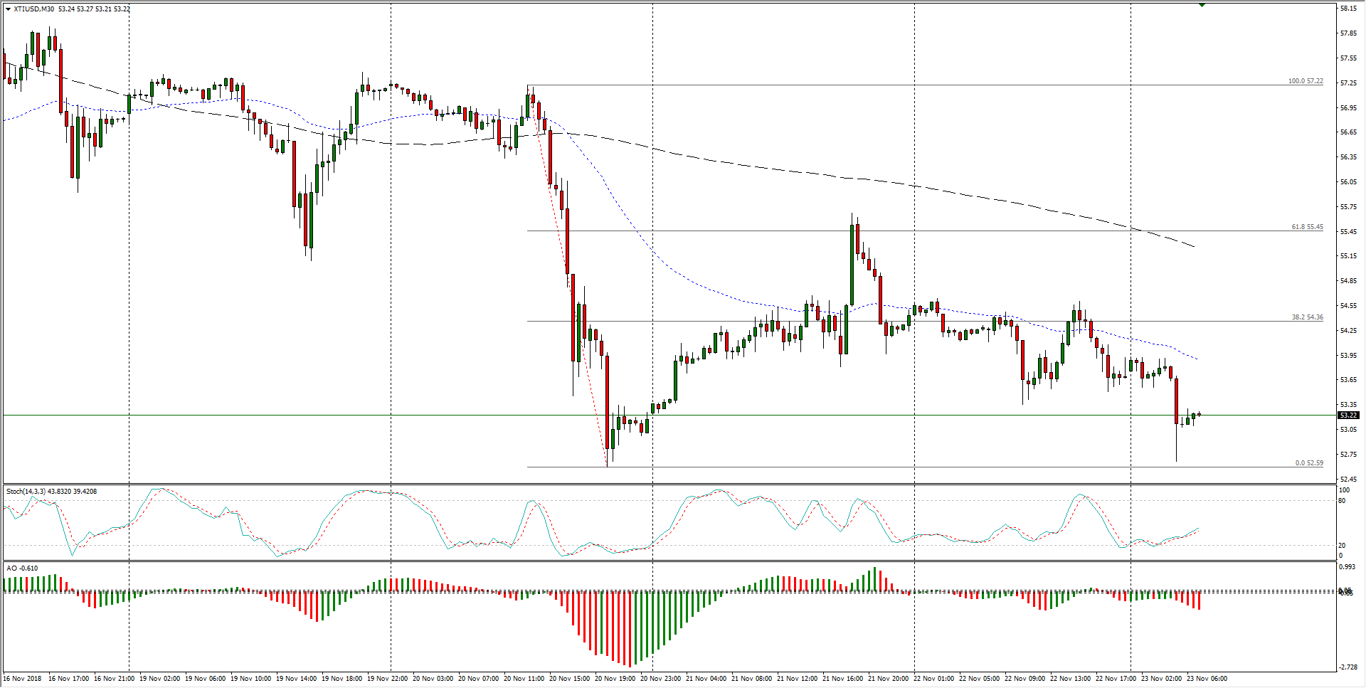 - Despite Friday’s early dip-and-rise, crude oil remains closely tied to recent action, with WTI currently chained to a range between the 38.2% Fibo retracement level at 54.36 and this week’s new low at 52.59.