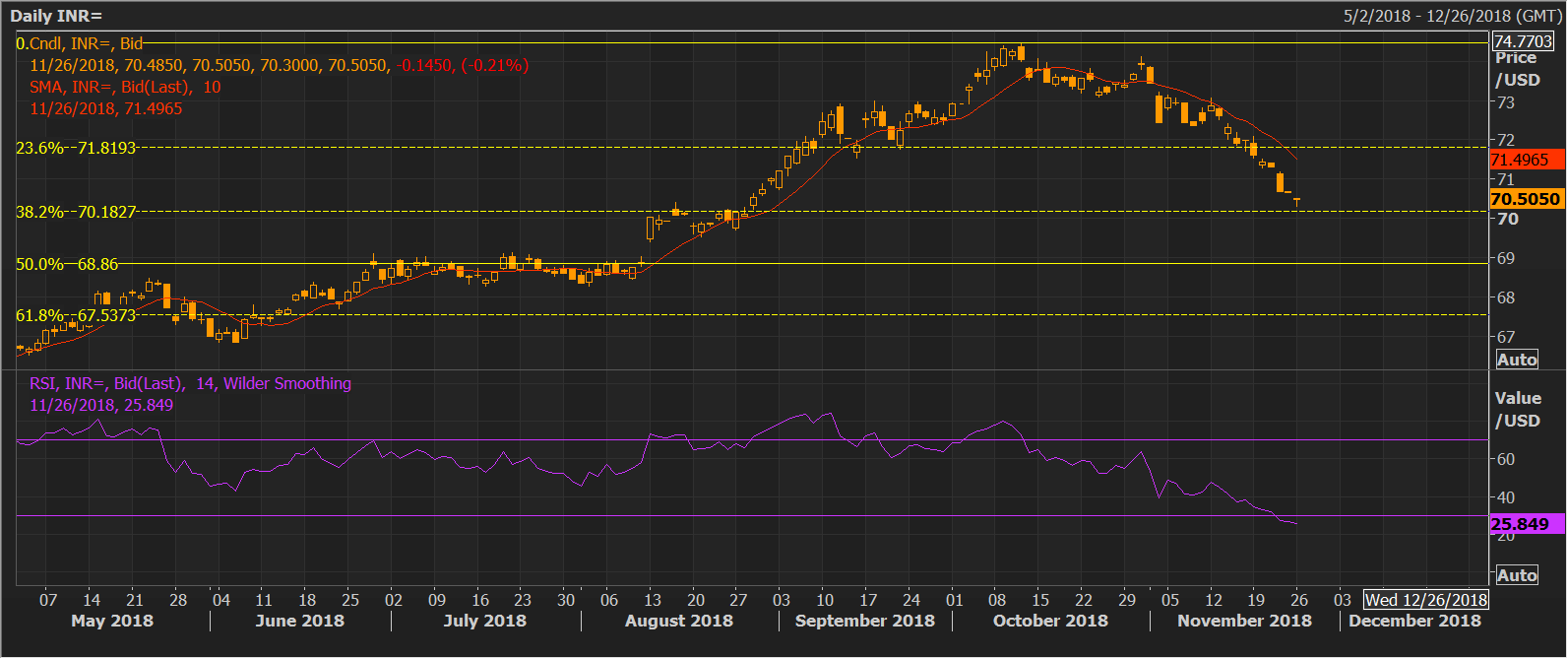 - As a result, USD/INR could test the downward sloping 10-day exponential moving average (EMA) in the short-term. At press time, the 10-day EMA is seen at 71.29. A failure to take out the 10-day EMA will likely recharge engines for a sustained break below the psychological support of 70.00. A close above the 10-day EMA would neutralize the immediate bearish outlook and could yield consolidation.