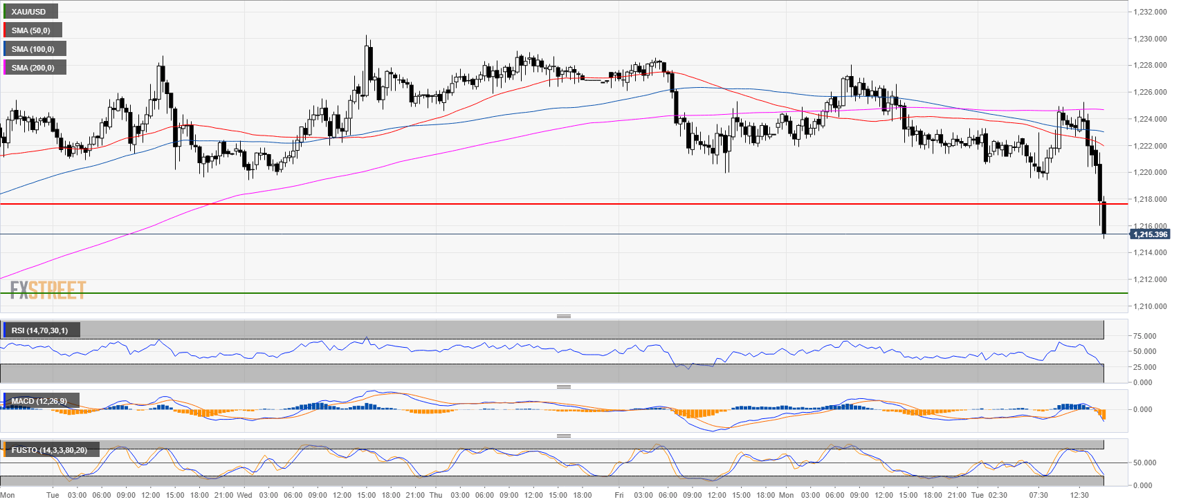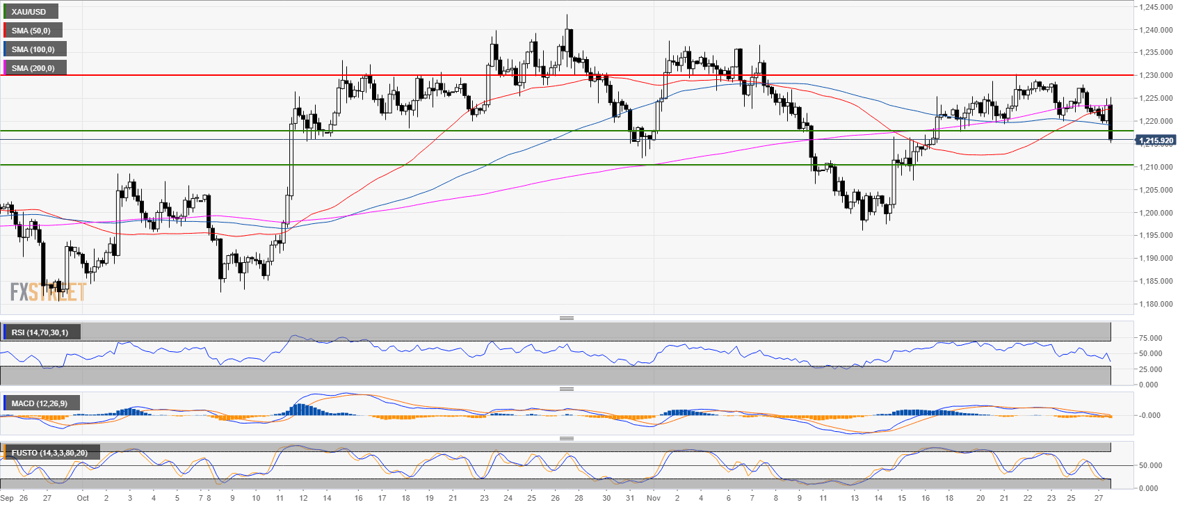 - Gold is breaking below the 1,217.70 support potentially opening the doors to 1,211.00 target in the coming days.