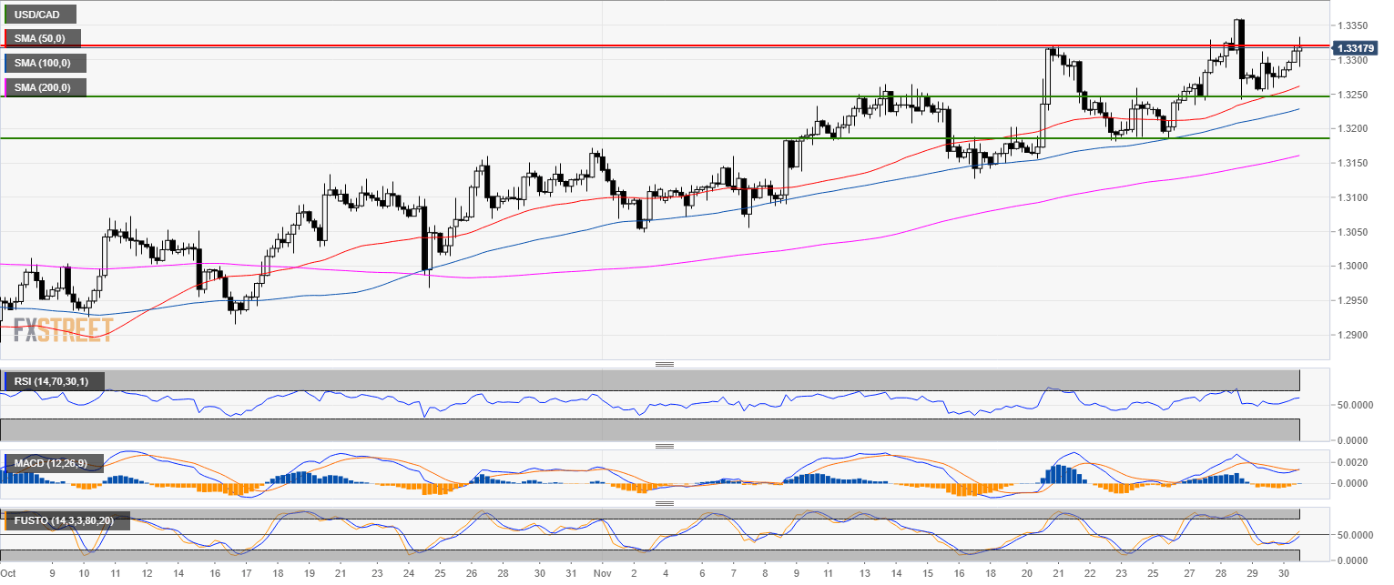 • USD/CAD bulls are knocking at the 1.3320 resistance as technical indicators remain bullishly configured.
