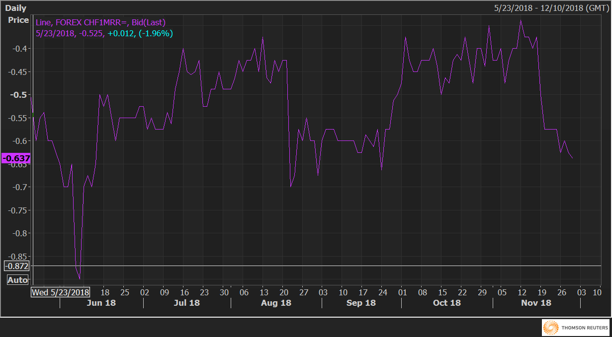The USD/CHF one-month 25 delta risk reversals (CHF1MRR) are currently trading at -0.673 in favor of put options – the level last seen on Sept. 24.