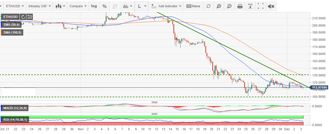 Ethereum has been range-bound for the last one week following the overpowering drop in November. There was an extended decline that tested $100 but fortunately a bounce occurred with the price making it above $110. Ethereum price plunged 48.63% in November and appears to have found a bottom around $100.