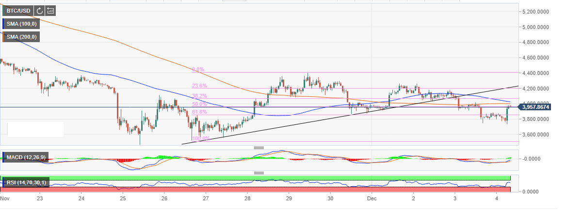 On the other hand, Bitcoin price started this week’s trading correcting lower after failing break above $4,400. The price tested $3,731.59 during the Asian trading hours before the current break out that has jumped above $3,900. BTC/USD is changing $3,966.21 while the bulls have eyes set on $4,000. Both the hourly 200 SMA and the 100 SMA would offer resistance at $4,000 and $4,027.76 in that order. The 61.8% Fib retracement level is the initial support but the primary support rests at $3,500.
