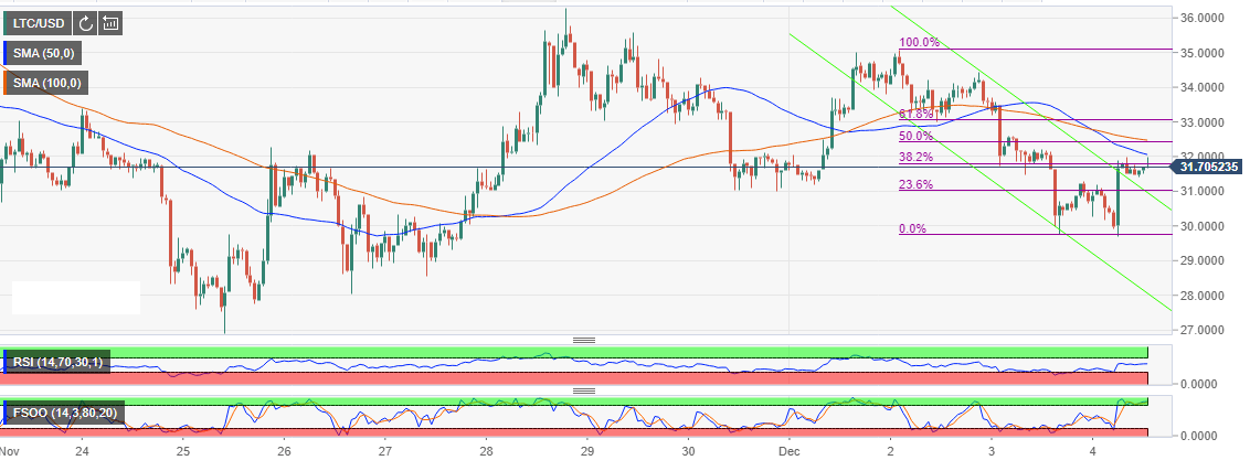 Litecoin recovery is taking effect at the time of writing. The asset is up 3.87% on the day, in addition, it has broken out of a short-term descending channel. Litecoin price is currently flirting with the 38.2% Fib level between the highs of $35.1 and the lows of $29.71. Further up, LTC/USD will face resistance at the 100 SMA and the 200 SMA (hourly range) at $32.06 and the 50% Fib level ($32.47) in that order. There will be seller concentration at $34.00 (immediate supply zone) and the swing high (upper supply zone). All the fundamentals point towards a bullish break for Litecoin price with the RSI ranging at 52 while the fast stochastic oscillator is in the overbought levels.