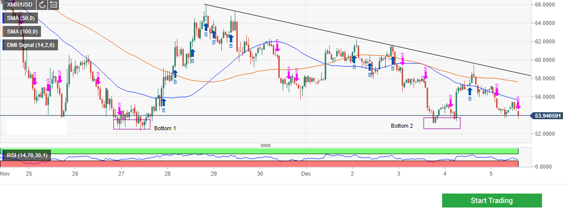 The 50 SMA is moving further beneath the 100 SMA to show that the sellers are still gaining ground against the bulls. The RSI on the same range is heading south. The selling pressure could see Monero extend declines to test $50.00.