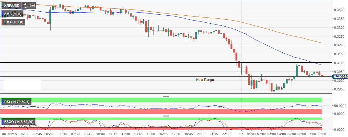 At the moment, XRP/USD is trading at $0.305 after getting stuck in a new range with an upper limit of $0.31. The 15-minutes 50 simple moving average is also standing in the way of upside movement at $0.309. If XRP escapes the range resistance it will run into another hurdle at the 100 simple moving average.