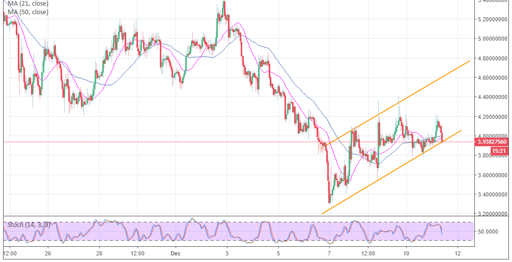 The recent decline found support at $3.3 before resuming the uptrend inside a bullish channel. The upside has been capped at $4.2 and ETC/USD bears seem to be getting ready to revenge and push the price towards the initial support at $3.8. Another support is highlighted at $3.6 while the major support rests at the recent lows, $3.3.